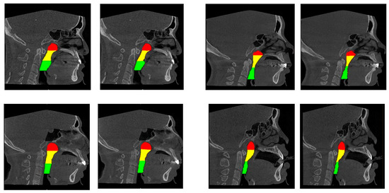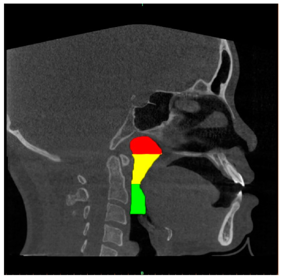 A well-trained dentist (CHU G, solo examiner) segmented the upper airway from the 2D images using the image processing tool Microsoft Paint in Windows 10 system. The airway structure in each image was segmented into three parts [13,19]: the nasopharynx, extending from the nasal turbinate level to the hard palate; the retropalatal pharynx, extending from the hard palate to the margin of the soft palate; and the retroglossal pharynx, extending from the soft palate to the epiglottic base. Each segment of the airway is shown using different colours in Figure 3.