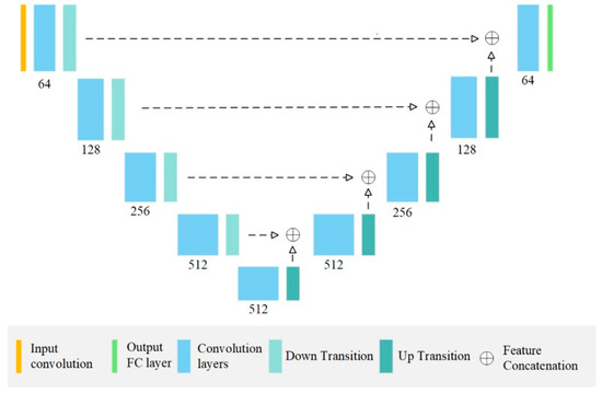 The segmentation architectures UNet and DeepLab v3 were selected as the training models. The UNet and DeepLab network architectures were each implemented at two depths: UNet18, UNet36, DeepLab50 and DeepLab101. These four AI models were then trained for the segmentation tasks. All the models were trained using the Adam optimisation algorithm at 200 epochs. The architecture was trained in the Pytorch framework (learning rate, 0.0001; batch size, 8) to achieve the best possible validation loss. All the processing work was conducted on a PC with an Intel i7-8700 CPU, 32GB RAM and a single Nvidia RTX 2080 Ti GPU with 12G VRAM (Jumbo computer supplies, Hong Kong, China). Figure 4 presents the network architecture of the UNet model.
