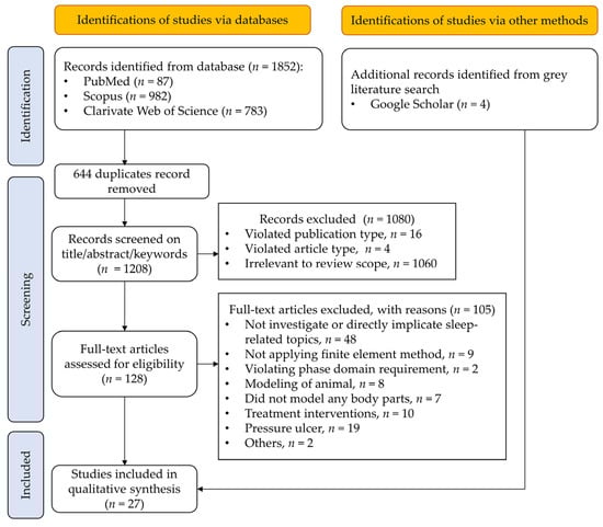 As shown in Figure 1, the initial search identified 1852 studies, and 1208 records were screened after removing 644 duplicates. We did a primary screening by title, abstract, and keywords, which resulted in the exclusion of 1080 publications for various reasons (violating the publication type criteria, n = 16; violating the article type criteria, n = 4; irrelevant to the review scope, n = 1060). Then, the eligibility of the 129 articles was evaluated through the full texts, and 105 studies were excluded for not investigating or directly implicating sleep-related topics, n = 48; not applying FE methods, n = 9; violating phase domain requirement, n = 2; modeling of animals, n = 8; did not model or model from any body parts, n = 7; treatment interventions, n = 10; pressure ulcers/sores, n = 19. In addition, two contentious studies were excluded upon consensus (others, n = 2). The first focused on the microgravity [], while the second one targeted on Down syndrome []. A Google Scholar search for grey literature yielded four results, totaling 27 studies conclusive for qualitative synthesis in this review [,,,,,,,,,,,,,,,,,,,,,,,,,,,].