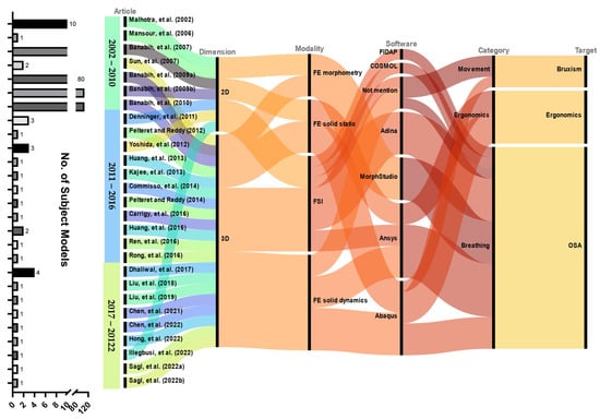 The earliest article dates back two decades (year range of included studies: 2002–2022). Despite working with two-dimensional (2D) models, the team was able to simulate fluid–structure interaction (FSI), which was relatively computationally intensive. There were 7 and 20 studies, respectively, that reconstructed 2D and three-dimensional (3D) models. For studies that did not explicitly address the FE solver, a solid mechanics dynamic solver was assumed for adaptive response modeling, especially neuromuscular control. Except for one study, all sleep ergonomic investigations used a solid-static/quasi-static solver, while all bruxism studies used a dynamic solver. The majority of OSA investigations applied FSI (n = 9); six of them (n = 5 dynamics; n = 1 static/quasi-static) employed solid mechanics modeling, while four of them exploited FE morphometry (n = 5).
