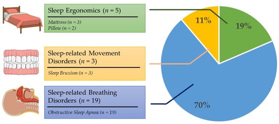 Figure 2 and Figure 3 map the general classifications and contexts of the included research. Three of the included studies (n = 3, 11.1%) focused on sleep bruxism, a kind of sleep-related movement disorder. Five studies (n = 5, 18.5%) investigated the sleep ergonomics of pillows (n = 2) and mattresses (n = 3). The remaining articles (n = 19, 70.3%) dealt with sleep-related breathing disorders, focusing solely on obstructive sleep apnea (OSA). There were no studies directly related to the other four categories, including insomnia, sleep-hypersomnolence disorders, circadian rhythm sleep–wake disorders, and parasomnia.