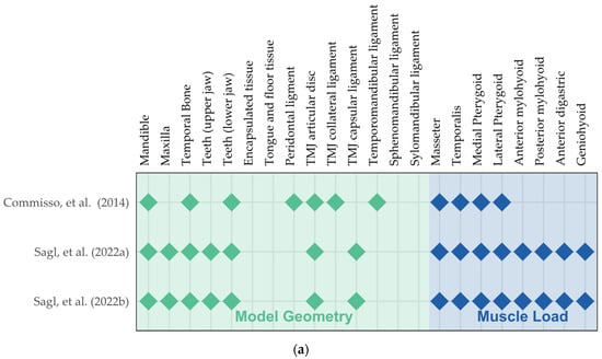 The other two studies conducted by Sagl’s research team [,] involved extensive modeling work and have been referenced in terms of model creation and validation [,,], as shown in Figure 4. In addition to comprehensive modeling on the temporomandibular (TMJ) ligaments and muscle load (Figure 4 and Figure 5a), they simulated lateral bruxing and examined the impact of various parameters, including tooth morphology, position, grinding direction, and bruxing power [,]. They emphasized their novelty in the estimation of muscle force by the forward-dynamics tracking approach that incorporated a reaction force tracking []. In addition to the stress at the temporomandibular joint, the authors explored the risk of dental wear by predicting the bruxing force at the molar and canine with computer models [].