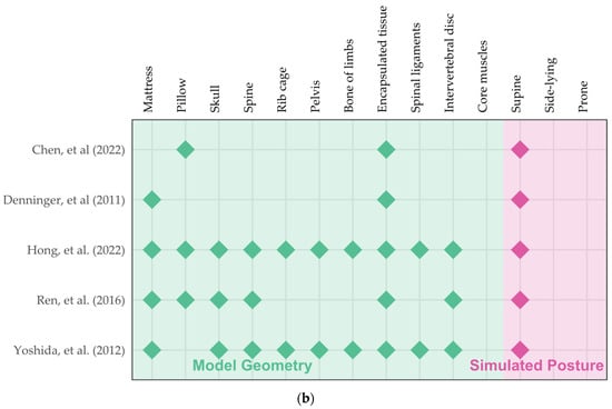Among the five studies in this category, two investigated the designs of pillows [,], while three targeted the designs of mattresses (Table 2 and Figure 5b). All studies only considered the supine lying posture. Using elevator mats, different pillow heights of a B-shaped pillow (often referred to as a cervical pillow) were simulated and examined. Ren et al. [] simulated 110, 130, 150, and 170 mm pillow heights (total height). They reported extension and lordosis trends of the neck with increasing pillow heights but have not indicated which pillow height is more advantageous. Chen et al. [] designed a B-shaped pillow with two peak heights at 48 and 65 mm, based on the head–neck curvature during standing, and simulated elevations of 10, 20, 30, 40, and 50 mm. Chen et al. [] concluded that an overall elevation of 35.9 mm (based on regression) could be the optimal pillow height since it closely approximated the same head–neck curvature following compression. Nevertheless, they reported a skeptical V-shaped trend on the stress of the neck. We believed that this may be owing to the unconstrained inferior cross-section of the neck, which shall be pulled by the spine from the trunk, as well as the use of a dynamic explicit solver for static scenarios. This issue may not exist in the model reconstructed by Ren et al. [] since their model recreated the cervical spine, rib cage, and thoracic region with simulation resting on both the pillow and mattress.