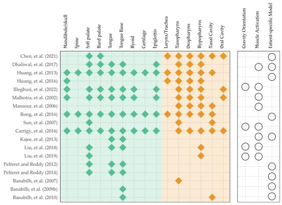 As given in Table 5, OSA was presumed by initiating an apnea breathing condition and compared to eupnea (i.e., normal breathing) by adjusting the boundary inlet air pressure [,], or by “paralyzing” the tongue (dilator) muscle [,,,]. The former could be accomplished by measuring pressure in vivo using a pressure transducer []. Specific techniques were presented to “paralyze” the tongue, i.e., to compare activation and inactivation of the dilator muscle, where collapsibility was defined by the changes in result between activation and inactivation []. Ilegbusi et al. [] applied a force–time activation function for the genioglossus, in which the magnitude of the force was determined by matching the profile of the airway opening at the epiglottis level observed in trials of neurostimulation. Malhotra et al. [] “activated” the dilator muscle by altering the elastic modulus of the soft tissue, whereas Rong et al. [] utilized spring elements to simulate the function of muscle to resist deformation.