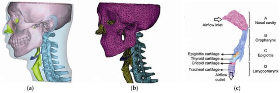 - Pelteret, J.P.; Reddy, B.D. Computational model of soft tissues in the human upper airway. Int. J. Numer. Methods Biomed. Eng. 2012, 28, 111–132. [Google Scholar] [CrossRef] [PubMed]