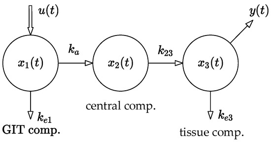 4]. Note that linear and nonlinear compartmental systems are essential for describing the transport of an administered drug throughout the body. In particular, the three-compartment system shown in