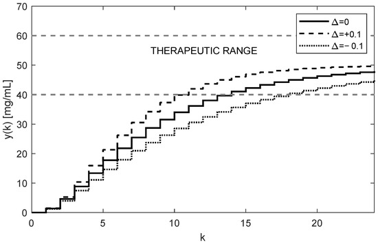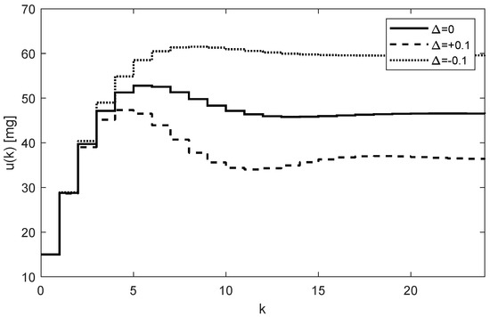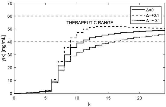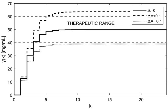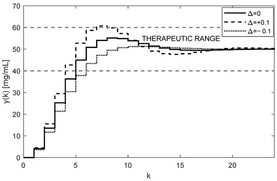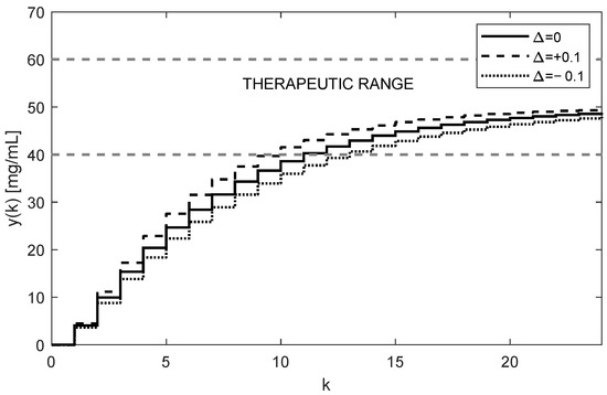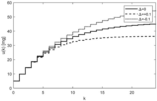 First, the doctor has no means through which they could speed up or slow down the transition process, i.e., the process of gradually approaching the steady-state value mg/mL. Second, the transition process of is unique as it cannot be modified by the constant input sequence . Therefore, there are cases where the transition process can last for an unacceptably long time. The third and most serious drawback is that the behavior of the system induced by the uncertainties cannot be automatically compensated for.