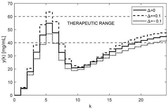 leaves the therapeutic range (dotted and dashed curves). This means that for model (6), the parametric uncertainties ±10% are too large; hence, the open-loop therapy can significantly jeopardize the patient’s health. This is the fourth serious drawback of the open-loop dosing strategy.