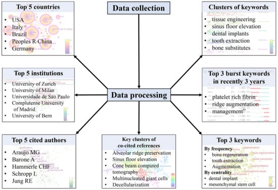 This study analyzed the top 10 most prominent publications in the past decade, with a focus on the evaluation of the effectiveness of ARP after tooth extraction [,,,,] (Figure 9).