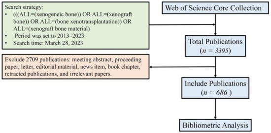 The first author conducted a literature search on the platform of Web of Science (WoS) in the “Web of Science Core Collection (WoSCC)” database using the search formula “((ALL = (xenogeneic bone)) OR ALL = (bone xenograft)) OR ALL = (bone xenotransplantation)” on 28 March 2023. The search period was from 2013 to 2023, and there were no restrictions on article types. A total of 3395 articles were retrieved. Two researchers conducted independent screening based on inclusion and exclusion criteria, and after review and verification, 686 articles were selected. The inclusion criteria were: (1) the article type was a research paper or review paper. (2) The research content was related to “research and application of bone xenografts of bone defects”. The exclusion criteria were: (1) Meeting abstract, proceeding paper, letter, news item, editorial materials, book chapter, and retracted publications. (2) Duplicates. (3) Articles unrelated to bone xenografts, such as organ transplantation, bone marrow transplantation, cancer bone metastasis, cardiovascular diseases, and cartilage tissue engineering. The screened literature was downloaded in the format of “fully documented and cited references”, including information such as title, abstract, keywords, publication year, authors, nationality, journal name, research direction, publishing institution, funding agencies, and references. That was saved as a plain text file in the raw analysis data sample (Figure 2).