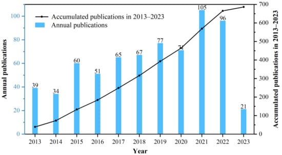 Information on the number of annual publications, research types, and other relevant data was extracted from the sample data. The data analysis software Origin (2021) was used to conduct a descriptive analysis of the data and create bar graphs. Additionally, we conducted visualization analysis using the CiteSpace (6.2.R2 Standard) software and the bibliometric online platform https://bibliometric.com/, accessed on 31 March 2023. With CiteSpace, we explored the collaboration or co-citation network of countries, institutions, authors, references, and keywords while identifying references and keywords clusters and burst items. On the https://bibliometric.com/ online platform, we conducted country cooperation relationship analysis to obtain statistical data and visualize knowledge maps.