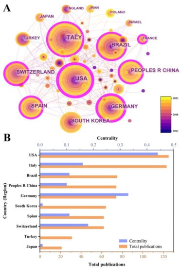 To identify the countries and regions with a significant number of publications and influential contributions of bone xenografts, we conducted a country (regional) cooperation analysis of the relevant literature. The national cooperation network diagram indicates a total of 63 nodes, 245 connections, and a network density of 0.1254 (Figure 4). Figure 5 presents the publication volume and centrality of the top 10 countries in terms of publication output. The United States is the most productive and influential country of international cooperation on bone xenograft, with 125 papers and a centrality of 0.44. Following the United States, the top five countries include Italy (123 papers, 0.16 centrality), Brazil (75 papers, 0.11 centrality), China (74 papers, 0.10 centrality), Germany (74 papers, 0.33 centrality), and South Korea (64 papers, 0.01 centrality). Moreover, countries with significant centrality (>0.1) include the United States, Germany, Switzerland (63 papers, 0.18 centrality), Italy, Brazil, Spain (62 papers, 0.11 centrality), France (15 papers, 0.11 centrality), and China. Notably, two highly cited papers published by France are “High-Temperature Sintering of Xenogeneic Bone Substitutes Leads to Increased Multinucleated Giant Cell Formation: In Vivo and Preliminary Clinical Results” [] and “MicroRNA 210 Mediates VEGF Upregulation in Human Periodontal Ligament Stem Cells Cultured on 3DHydroxyapatite Ceramic Scaffold” [].