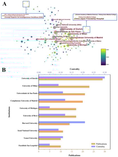 To identify institutions with significant influence, we conducted an analysis of institutional co-occurrence based on relevant literature (Figure 6). Figure 6A displays the main institutional collaboration network of bone defects using bone xenografts, resulting in 285 nodes, 436 connections, and a density value of 0.0109. Figure 6B presents the publication volume and centrality of the top 10 institutions in terms of publication output. The institution with the strongest contribution and influence is the University of Zurich, with 29 publications and a centrality of 0.3, which indicates significant centrality. Other institutions that have made significant contributions include the University of Milan, the University of Sao Paulo, etc. In 2023, there was a collaboration between Peking University and China-Japan Friendship Hospital that resulted in the publication of a paper titled “Safety and Efficacy of Midface Augmentation Using Bio-Oss Bone Powder and Bio-Gide Collagen Membrane in Asians” [], while institutions in Spain collaborated to publish “Physico-chemical and biological characterization of a new bovine bone mineral matrix available for human usage” [].