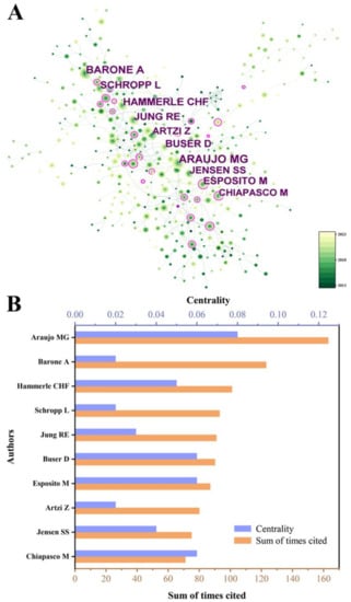 To identify highly influential authors in bone xenograft, we conducted a co-authorship analysis (Figure 7). We generated a co-citation network map comprising 476 nodes and 3210 connections (Figure 7A), with a density value of 0.0284. Figure 7B shows the citation counts and centrality of the top 10 most cited authors. Among them, Araujo MG was the most cited author in the past decade, with 163 citations and a centrality of 0.08. His most cited publication was “Dimensional ridge alterations following tooth extraction: An experimental study in the dog”, which explored the histological changes in alveolar bone absorption and remodeling after tooth extraction []. Froum SJ had the highest centrality with 46 citations and a centrality of 0.09. His most cited publication was “Vertical distance from the crest of bone to the height of the interproximal papilla between adjacent implants”, which found that the average height of the interproximal papilla between adjacent implants was 3.4 mm, ranging from 1 mm to 7 mm [].