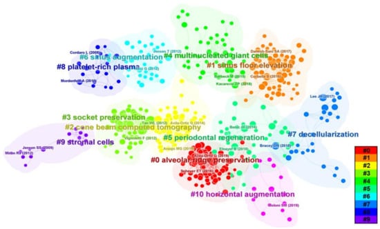 The second-ranked literature, with a centrality of 0.16, was a 2016 publication by Vittorio Favero et al. titled “Sinus floor elevation outcomes following perforation of the Schneiderian membrane. An experimental study in sheep” []. This study assessed the effect of covering collagen membranes on bone formation after sinus membrane perforation in sheep and found that using collagen membranes on relatively small sinus mucosal perforations may result in greater new bone formation []. The third-ranked literature, with a centrality of 0.14, was a 2017 publication by Tim Fienitz et al. titled “Histological and radiological evaluation of sintered and non-sintered deproteinized bovine bone substitute materials in sinus elevation procedures. A prospective, randomized-controlled, clinical multicenter study” []. This study investigated the effectiveness of sintered and non-sintered bovine bone substitutes in maxillary sinus floor elevation (MSFE) and found that both groups had comparable new bone formation and volume stability []. We also conducted a clustering analysis of co-cited literature to identify the research foundation and focus areas. As shown in Figure 8, there are 10 main clusters, with earlier research hotspots on stromal cells, platelet-rich fibrin (PRF), socket preservation, and MSFE on the left. Recent hotspots appear on the right, including decellularization and multinucleated giant cells (MGCs), among others.