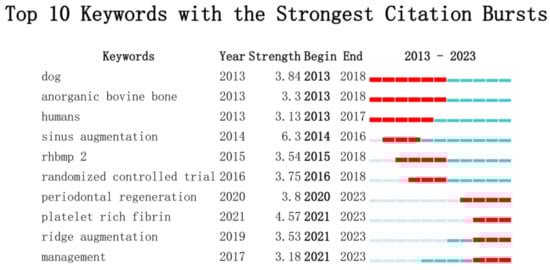 We conducted a co-occurrence analysis on the acquired data to identify hot topics and urgent issues (Figure 10). To further obtain recent hot keywords, we applied the burst detection algorithm based on co-occurrence. A total of 298 nodes and 2733 connections were obtained, with a density value of 0.0618. The top three keywords in terms of frequency are “bone regeneration” (125 times), “tooth extraction” (116 times), and “augmentation” (112 times). The top two keywords in terms of centrality are “dental implant” (0.07) and “mesenchymal stem cell” (0.06).