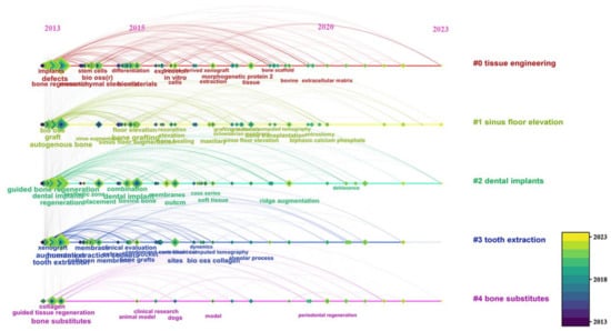 Cluster analysis was performed on keywords, as shown in Figure 12, resulting in five main clusters: “tissue engineering”, “sinus floor elevation”, “dental implants”, “tooth extraction”, and “bone substitutes”. These clusters are primarily focused on dentistry.