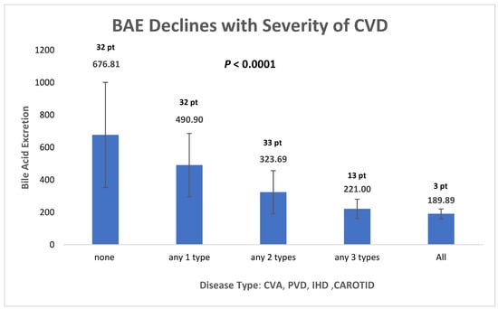 This study examined fecal BAE in patients with PVD of the legs and carotid arteries compared to patients without PVD. The results show an association between low BAE and the severity of PVD as well as CA disease in terms of lower survival rates. In previous research, we showed that BAE is positively correlated with CAD and with the occurrence of stroke [9,10]. Remarkably, the correlation of BAE with PVD is stronger than the correlation with stroke and CAD. This suggests that the more diffuse the atherosclerotic process involving the peripheral vasculature, the lower the BAE. This new finding was seen when the excretion of the main BA fractions was measured. Excretion of deoxycholic, lithocholic, and cholic acids was significantly higher in individuals without evidence of peripheral atherosclerosis. Importantly, patients without PVD or CA disease excreted 60% more total BA, deoxycholic acid, and lithocholic acid than patients who had only PVD or CA disease, and those excreted 20% to 60% more BA (total and fractions) than patients with PVD and CA disease. Patients without PVD and without CA disease had a total BAE >566 mg/24 h in comparison to patients with only PVD or PVD plus CA disease, who had a BAE <296 mg/24 h. These results may suggest that high levels of BAE may be protective against PVD.