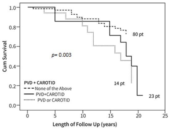 Survival after 22 years among patients with PVD and carotid artery stenosis was 15% (Figure 3), indicating mortality was 4.3-fold higher compared to those without evidence of PVD and CA disease (including carotid artery stenosis), without stroke or CAD (p = 0.01). Survival of patients with carotid artery stenosis alone was 22% (Figure 4), indicating mortality was 2.7-fold higher compared to the groups mentioned above. Seventy-one patients had either PVD, CA, CVA, or CAD. Among these patients, 60.4% died; 3.8% died due to infections and 3.8% because of accidents (falls, motor vehicle accidents); 59.8% died because of CA, PVD, CAD, or CVA single or polyvascular disease.