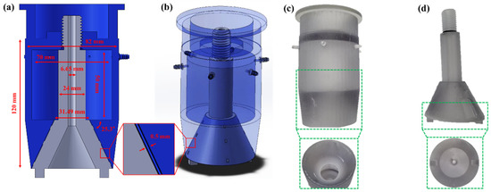 Modeling and drawings were constructed using a 3D CAD program (Solidworks 2016, Dassault Systemes SolidWorks Corp., Waltham, MA, USA). A prototype was set such that the air exited in the 25.3° direction, and the inner space was designed with a diameter and height of 70 and 50 mm, respectively (Figure 1a). In addition, six small hose connectors were constructed to receive air from the compressor (Figure 1b). Based on the drawing data, a prototype was manufactured using a 3D printer (Object 260 Dental, Stratasys Ltd., Eden Prairie, MN, USA) as shown in Figure 1c,d.