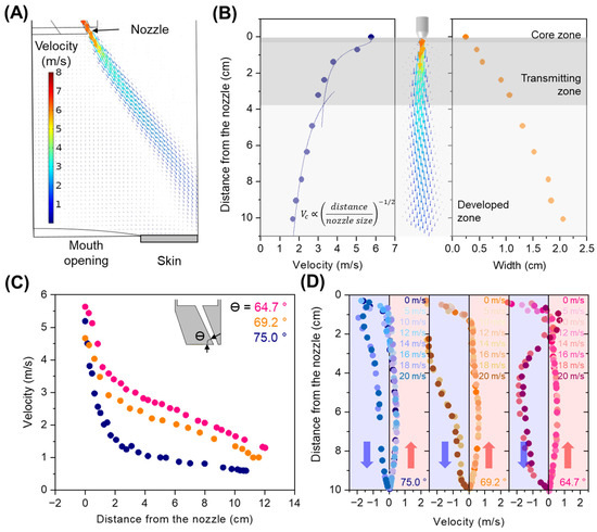 Figure 4A exhibits the representative velocity distribution of the air barrier. The facial model was placed 100 mm away from the air-barrier device, in which the air jet was injected at a velocity of 5.8 m/s and an angle of 75° with respect to the bottom surface of the system, and no ventilation velocity was applied. In addition, a strong air stream was generated along the direction of the injection nozzle, indicating the successful formation of an air barrier. Some of the important features are that downward flow occurs in the proximity of the air barrier, whereas upward flow is found in the area away from the air barrier, leading to re-circulation in the patient zone. The velocity and width of the air barrier were recorded along the central line of the stream (Figure 4B). From the analytical models of the air barrier [16,19,29,30], we identified three distinguishable regions: (1) potential core, (2) transition, and (3) developed zones. In the potential core zone, the centreline velocity is almost constant and close to the initial speed in the nozzle; in the transition zone, the velocity starts to decay and the jet expands, generally starting at approximately 5 o (o—characteristic dimension of nozzle) from the nozzle; in developed zone, velocity decay remains constant, generally starting at approximately 20 o from the nozzle.