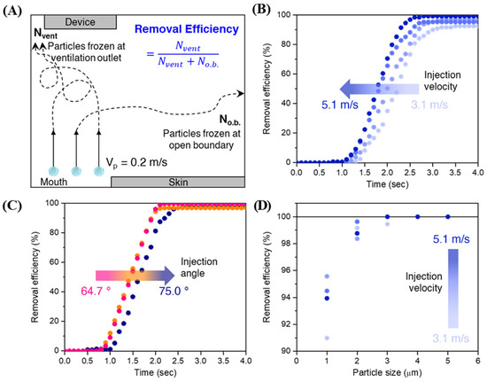 Microparticles evacuation. (A) Schematic illustration of calculation for vented particles (%). (B) Rates of vented particles (%) at varied injection velocities. (C) The removal efficiency as a function of time at differing injection angles. (D) The removal efficiency of microparticles in the range of 1 μm to 5 μm at different injection velocities.
