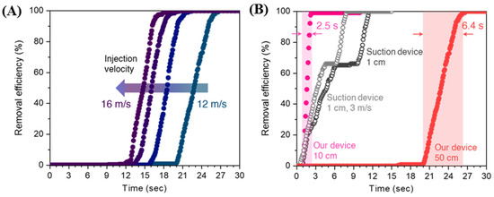 Furthermore, we simulated the performance of an air-barrier device at a reasonable distance (500 mm) from the patient’s mouth to secure sufficient working space for the practitioner in a real dental operation. The removal efficiency rates obtained at an injection angle of 64.7°, ventilation velocity of 2 m/s, and different injection velocities are shown in Figure 6A. A well-defined removal curve was observed for all the injection velocities. The removal saturation time of 26.8 s was achieved at the injection velocity of 12 m/s, and this value decreased to 22.5, 20.9, and 18.8 s at the velocities of 13, 15, and 16 m/s, respectively. A long-distance likely gives rise to a long pathway to reach the ventilation hole, thereby increasing the removal time compared to the short distance (100 mm). However, their CRE indices achieved infinity, which means saturated removal efficiency was 100%, demonstrating that the device effectively prevents the recirculation of contaminants in the patient zone (Video S2). For comparison, we also simulated a dental suction device placed 10 mm above the patient’s mouth and evaluated its removal efficiency rate (Figure 6B). At the same ventilation velocity of 2 m/s, the removal time was substantially longer (~12 s) than that of the device, which was located 10 mm above the patient. Furthermore, the actual removal time, which corresponds to the time after the turn-on of removal, even at a faster ventilation velocity of 3 m/s, is two-fold longer than that of the devices installed 500 mm above the patient. As the patient continuously discharges contaminants during dental treatment, this result preliminarily suggests that the device is beneficial for removing contaminants not only quickly but also effectively.