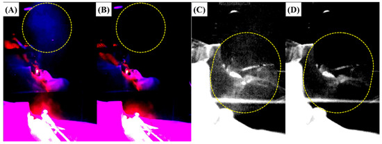 Observation of bioaerosol trajectory using high-speed camera when the air-barrier device was off (A,C) and on (B,D). (A,C) Lots of bioaerosol ejected from the oral cavity and diffused to the outside when the air-barrier device did not operate during the operation of the dental handpiece. A UV light and fluorescent substance was used to emphasize the bioaerosol captured by a high-speed camera. (B,D) Almost no bioaerosol was observed during the operation of the dental handpiece when the air-barrier device was activated.