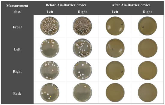 Detection results of bacteria in two media attached to each of the four sides of the experiment table before and after using the air-barrier device.