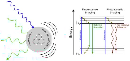 Figure 1. Differences in signal transduction arise from radiative and non-radiative emission events. Both fluorescence and PA imaging are noninvasive, non-ionizing, capable of real-time imaging, and are often used together to provide complementary information about biological samples [