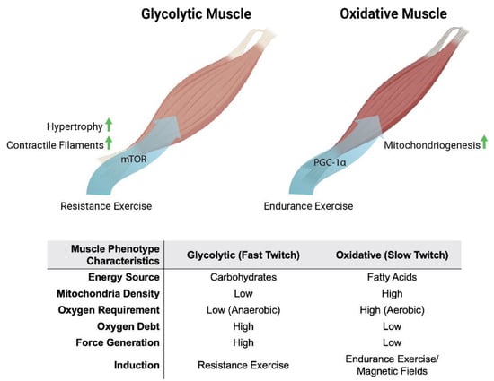 Metabolic and phenotypic characteristics of glycolytic and oxidative muscles in response to exercise and magnetic fields. Original figure created with BioRender.com.