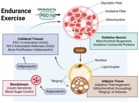 PGC-1α is upregulated in adipose tissue [,] following its activation by irisin [,]. Irisin-activated adipose, in turn, reciprocally secretes adiponectin, which bolsters muscle and bone development and metabolism [,,]. Brown adipose tissue (BAT) releases a distinct combination of adipokines from white adipose tissues, collectively known as batokines, that regulate the development and metabolism of muscle and collateral tissues []. Conversely, adiponectin is produced and secreted by skeletal muscle in response to exercise in association with oxidative-muscle expression []. Irisin, in turn, is produced and released by adipose in response to circulating irisin and exercise [,,], acting to consolidate the exercise response via mutual secretome crosstalk. Irisin generally upregulates PGC-1α and the nuclear factor erythroid 2–related factor 2 (Nrf2) in recipient tissues []. In particular, the human visceral fat deposit has a preponderance to be highly inflamed and is a strong contributor to metabolic disruptions but is highly susceptible to exercise-induced browning []. Visceral fat, hence, represents a valid therapeutic target for the development of interventions to control the rising global incidence of metabolic dysfunction. Muscular respiratory activity, hence, elicits a systemwide cascade of PGC-1α-dependent secretome responses that underlie the metabolic benefits commonly attributed to exercise.