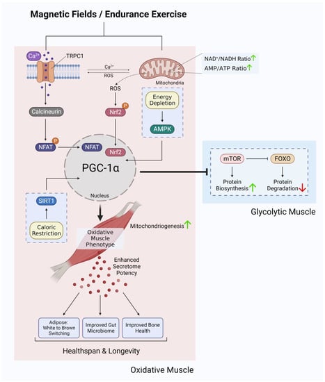 A biosynthetic penalty seems to exist with reference to lifespan. Its roots extend from the finding that inhibiting the mTOR pathway, which governs protein accrual and is, hence, responsible for muscle hypertrophy, with rapamycin ameliorates immunosenescence [] and extends lifespan []. On the other hand, insulin and the insulin-like growth factor 1 (IGF-1) are potent activators of mTOR and muscle growth [] and are negatively correlated with longevity []. It is broadly recognised that mitochondrial health and human health are strongly intertwined and, conversely, that ageing is associated with impaired mitochondrial maintenance []. Notably, the promotion of oxidative-muscle development by PGC-1α comes at the expense of mTOR activation and muscle hypertrophy in favour of mitochondrial pathways [,,]. Activation of the AMPK/PGC-1α pathway extends lifespan while inhibiting the insulin/Akt/mTOR pathway [,]. Evidence also exists that caloric restriction extends lifespan [,,]. As caloric restriction shares many of the hallmark features of our magnetic-stimulation paradigm such as Sirt1 and PGC-1α activation, upstream of mitochondrial biogenesis [,], muscle magnetic-field therapy may offer a non-invasive method to promote longevity. Indeed, Sirt1 and PGC-1α activities converge at the level of mitochondrial respiration. In response to mitochondrial low-energy status, manifested by an elevated NAD+/NADH ratio, Sirt1 deacetylates PGC-1α, rendering it capable of promoting mitochondriogenesis []. It is thus intriguing to speculate that attenuating mTOR-mediated biosynthesis via the magnetic induction of the calcineurin, PGC-1α and Sirt1 pathways, may serve to help improve the quality of life of the elderly. Finally, the muscle secretome has recently been shown to contain factors, such as the DEP-domain-containing mTOR-interacting protein (DEPTOR), that specifically inhibits mTOR []. Magnetic therapeutic interventions may potentially provide a manner to shift the relative emphasis of the disparate glycolytic and oxidative-muscle secretomes [] for the modulation of human healthspan and lifespan.