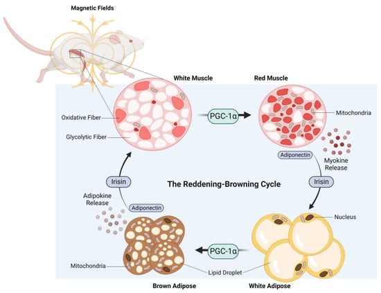 The reddening–browning cycle of magnetically-induced oxidative-muscle development closely mirrors the endurance-exercise-based metabolic adaptations. Original figure created with BioRender.com.