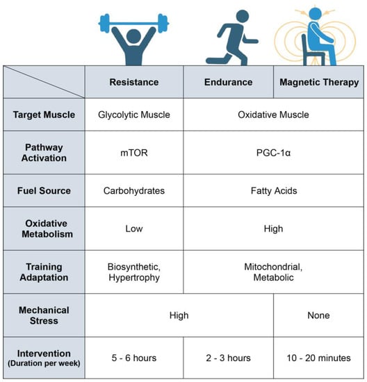 Breakdown of the physiological differences between resistance training, endurance training and magnetic-field intervention. Magnetic therapy refers to the use of extremely low frequency pulsed electromagnetic fields (ELF-PEMFs) such as those previously described [,,,,,,,,]. Original figure created with BioRender.com.