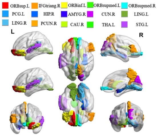- Nathalie, T.M.; Brigitte, L.; Dimitri, P.; Fabrice, C.; Olivier, E.; Nicolas, D.; Bernard, M.; Marc, J. Automated anatomical labeling of activations in SPM using a macroscopic anatomical parcellation of the MNI MRI single-subject brain. Neuroimage 2002, 15, 273–289. [Google Scholar] [CrossRef]