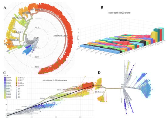 - Hadfield, J.; Megill, C.; Bell, S.M.; Huddleston, J.; Potter, B.; Callender, C.; Sagulenko, P.; Bedford, T.; Neher, R.A. Nextstrain: Real-time tracking of pathogen evolution. Bioinformatics 2018, 34, 4121–4123. [Google Scholar] [CrossRef]