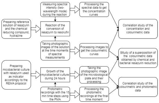 - Postnikov, E.B.; Lavrova, A.I.; Khalin, A.A.; Dogonadze, M.Z.; Manicheva, O.A. Spectrophotometric vs. colorimetric analysis of Mycobacterium tuberculosis population growth curves in resazurin assay. Proc. SPIE 2019, 11067, 110670L. [Google Scholar] [CrossRef]