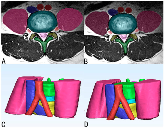 Results of manual and automatic segmentation of MRI images and the 3D model of L4/5 level. (A,C) Manual segmentation; (B,D) automatic segmentation.