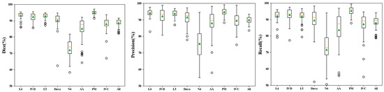 The 3D Deeplabv3+ achieved good performance in terms of DSC, precision, and recall for segmentations of various anatomical structures, including bones (L4 and L5), dura mater, discs, nerves, abdominal aorta, inferior vena cava, psoas major, and all 8 spinal structures at the L4/L5 level. The median value and mean value are represented by the orange line and green triangle in the box, respectively.