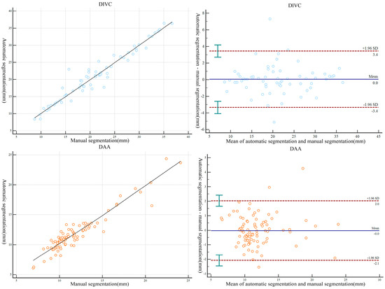 Scatterplots and Bland–Altman plots comparing measurements made by the L4/5 segment 3D model produced from manual and automatic segmentation methods. DAA, the maximum diameter of the abdominal aorta in the middle of the L4/5 intervertebral disc; DIVC, the maximum diameter of the inferior vena cava in the middle of the L4/5 intervertebral disc.