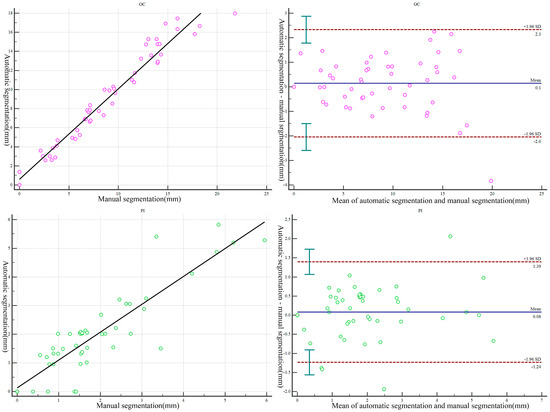 Scatterplots comparing measurements made by the L4/5 segment 3D model produced from manual and automatic segmentation methods. OC, the shortest distance between the psoas major and the abdominal aorta in the middle of the L4/5 intervertebral disc; PI, the shortest distance between the psoas major muscle and the inferior vena cava in the middle of the L4/5 intervertebral disc.