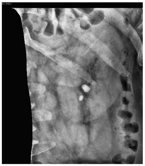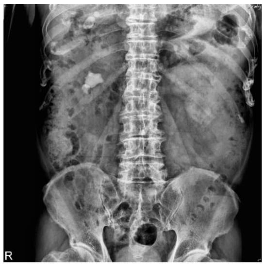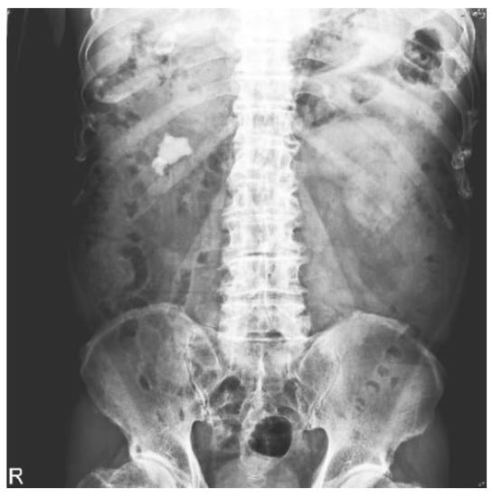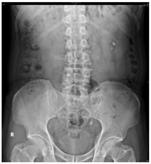 X-rays are low-cost and low-radiation imaging modalities that are widely used in various stutabledies for computer-aided diagnosis (CAD) development, including chest X-rays for COVID-19 detection with DL models [4], breast X-rays for detecting breast cancer [5], and abdominal X-rays for assisting in the diagnosis of muscle coordination disorders [6]. In this study, X-ray kidney–ureter–bladder (KUB) images were used (Figure 1). In this figure, the white area inside the red frame is a urinary tract stone, as a specialist would diagnose. KUB imaging has a few limitations, including its two-dimensional nature, which may lead to false positives and make it difficult to distinguish between abnormalities in high-density tissues [7]. The sensitivity of KUB imaging in detecting renal stones ranges from 44 to 77%, with a specificity of 80–87% [8], whereas computed tomography (CT) has a sensitivity of 94–100% and a specificity of 92–94.2% [9,10]. Noncontrast CT is the most accurate imaging modality for kidney stones owing to high sensitivity, specificity, accurate stone sizing, and the ability to evaluate non-stone-related pathologies [11].