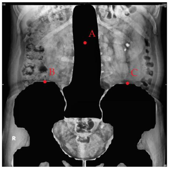 A is the central point of spine, B is the upper point of the right pelvis, and C is the upper point of the left pelvis.