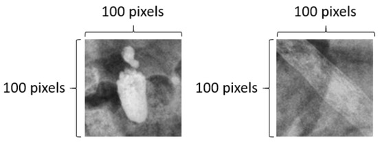 A 100 × 100-pixel image was cropped from the KUB image. An image with urinary tract stones was positioned at the center of the image. Cropped images without urinary tract stones were randomly selected from the KUB images, as illustrated in Figure 12. Based on a 100 × 100-pixel image, we introduced the concept of a sliding window for real-world applications. A sliding window is used to capture the presence of stones in the image. If stones were detected in the cropped image, we would map them back to the original KUB image and obtained their location. Once the full-image scan was complete, we extracted the image based on these specific locations and performed mask detection using the segmentation model. After mask detection was complete, we merged it back with the original image via mapping and positioning, thereby obtaining a complete KUB stone mask image.