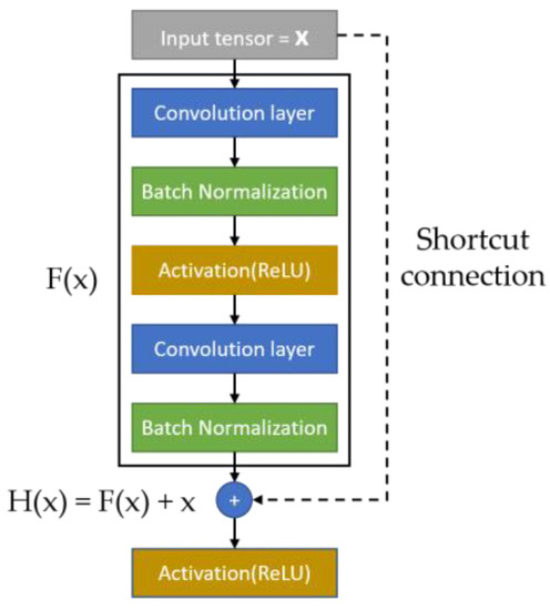 Previous studies have shown that the deeper the CNN, the finer the features it can extract [53]. However, in 2016, Kaiming discovered that the model’s performance decreased and experienced degradation when the network layer became excessively deep [54]. To solve this problem, they proposed a network structure called ResNet, which introduced the concept of a residual block. The residual block copies the output of the source layer directly to the shortcut connection and adds it to the output of the main framework, as illustrated in Figure 14. If the layers in the residual block do not learn any features, the output of the block is the same as the input; this is called identity mapping. Residual blocks address the problem of model degradation caused by overly deep networks, allowing the number of network layers to increase.