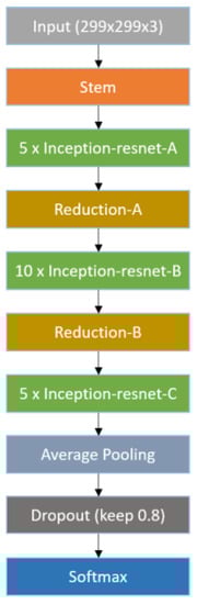 In 2016, Google proposed Inception-ResNetV2 as an improved version of Inception-ResNetV1 [55], which achieved the best performance in the ILSVRC image classification benchmark test [56]. The core concept of Inception-ResNetV2 is to combine inception modules and residual direct connections using residual connection shortcuts to successfully train deeper neural networks while significantly simplifying inception modules. As indicated in Figure 15, the structure of Inception-ResNetV2 is divided into several parts: Stem, Inception-Resnet-A, Reduction-A, Inception-Resnet-B, Reduction-B, and Inception-Resnet-C. The A, B, and C modules use asymmetric convolutional layers and 1 × 1 convolutional layers to reduce or unify dimensions, and modules A and B are designed to gradually reduce the size of the feature map to avoid the loss of related information. By combining the above modules, Inception-ResNetV2 can achieve a deep network architecture without encountering the problems of gradient disappearance and can converge better. Recently, Inception-ResNetV2 has been increasingly used for medical image recognition. For example, a previous study [57] explored the application of Inception-ResNetV2 for brain tumor detection. Other studies have also implemented Inception-ResNetV2 in various applications, such as skin lesion classification methods [58,59] and benchmark testing for aortic pathology analysis [60].