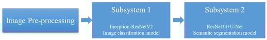 In this study, all images were divided into three datasets, with a total of 1340 images. Among these, 970 images were used for training (80%) and validating (20%) the model; the training set contained 776 images, and the validation set 194 images. The remaining 370 images were used as the test set to evaluate the performance of the model and its generalization ability. Both subsystems used Ranger as the optimizer [67], which is an integration of two optimizers: RAdam [68] and LookAhead [69]. The loss function used in subsystem 1 was binary cross-entropy. For the semantic segmentation model, ResNet50 was used as the primary feature extractor network, and U-net utilized the features for prediction and mask generation. Ranger was used as the optimizer, and the loss function was composed of binary cross-entropy and Jaccard distance.