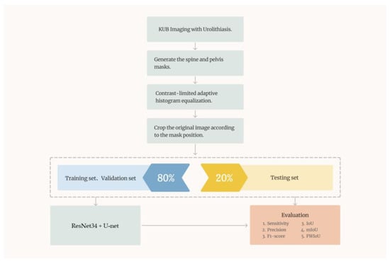 Recently, the rapid development of machine learning and artificial intelligence has facilitated the application of CAD in medical image processing. The exceptional performance of convolutional neural networks (CNNs) in learning and computation across various domains [21,22,23,24] has led to their widespread adoption in CAD. The accuracy of CAD models incorporating CNNs has gradually improved over time [25,26]. Recent studies have applied neural networks to diagnose urinary system diseases using CT imaging [27,28,29]. CNN models have exhibited a sensitivity of 89.6% and a positive predictive value of 56.9% in detecting urinary stones during X-ray examinations [30]. Liu et al. [31] combined image preprocessing and data augmentation techniques with the ResNet model to detect renal stones on KUB images, and achieved an accuracy, sensitivity, specificity, and F1-measure of 0.982, 0.964, 1.000, and 0.982, respectively.