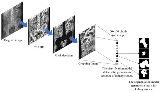 First, we classified the KUB images based on the presence or absence of renal stones and masked the images with renal stones after classification. The preprocessed and classified renal stone images have reduced misjudgments during segmentation. The segmented stone positions will further assist physicians in diagnosis. Our CAD system has demonstrated that X-ray images can be effective in detecting renal stones, offering a promising research direction and providing an alternative system in renal stone diagnosis using KUB imaging, in addition to CT imaging. While research on the use of plain film X-ray images to detect renal stones is sparse, the results of this study are promising and indicate bright prospects for future research.